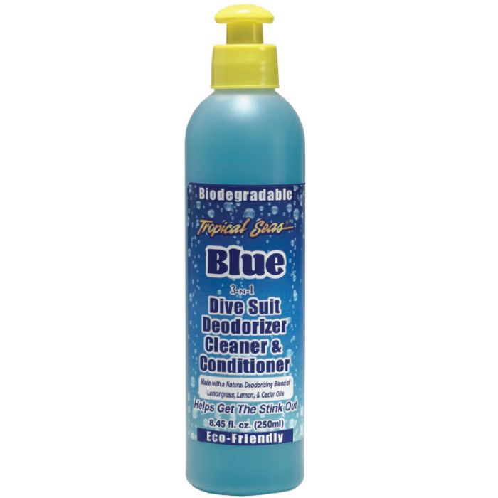 BLEU est un nettoyant tout usage et désodorisant biodégradable. Fonctionne sur les combinaisons en néoprène, les cagoules, chaussettes, bottes, gilets, etc. Aide à éliminer le sel, le chlore, la sueur, la pollution, les odeurs et autres résidus. Désodorise, nettoie et conditionne, tout en contribuant à maintenir la souplesse des costumes.
