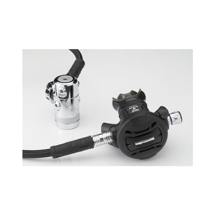 Comprend un système d'échappement interchangeable (DCE) innovant. Ce système donne au plongeur la possibilité de passer d'un petit té d'échappement à un grand té d'échappement. Cela donne à l'utilisateur un choix, un té d'échappement plus large pour une interférence minimale des bulles (essentiel pour la photographie sous-marine) et un té d'échappement étroit pour un régulateur confortable et compact plus petit. Le régulateur est fourni avec les deux ensembles de tés d'échappement.