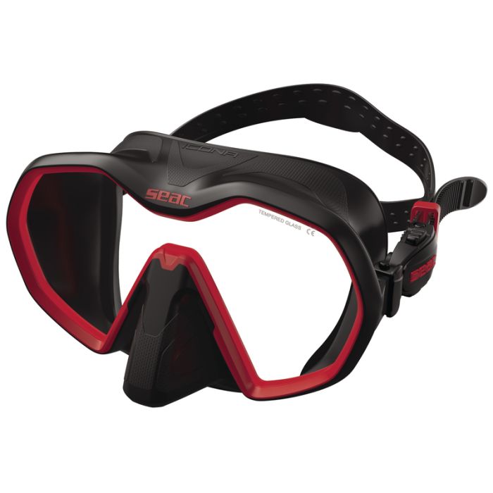 Le SEAC ICONA est un masque « frameless » mono-verre haut de gamme. 100% fabriqué en Italie sans aucun plastique sur la jupe ou le cadre. Le verre renforcé de 4mm est entouré de 2 types de silicone moulés pour une jupe qui s’adapte parfaitement au visage. Le silicone intérieur est mat pour éviter tout reflet gênant. La bordure externe de la jupe est légèrement recourbée pour une adhérence et une étanchéité maximales.