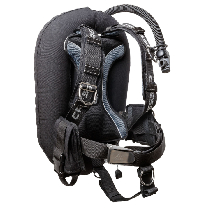 La ceinture unique de 50 mm qui entoure les épaules et la taille peut être rapidement adaptée à la taille du plongeur. La forme de la chambre à air a été pensée pour assurer une flottabilité parfaite avec un seul cylindre. La plaque arrière en alliage léger anodisé réduit le poids total de la veste tout en garantissant stabilité et sécurité d'utilisation. Le particulier repose-cylindre en caoutchouc thermoplastique intégré au dos de la veste garantit le positionnement du réservoir pour une assiette optimale.